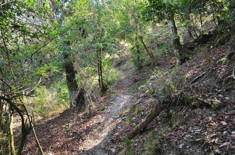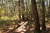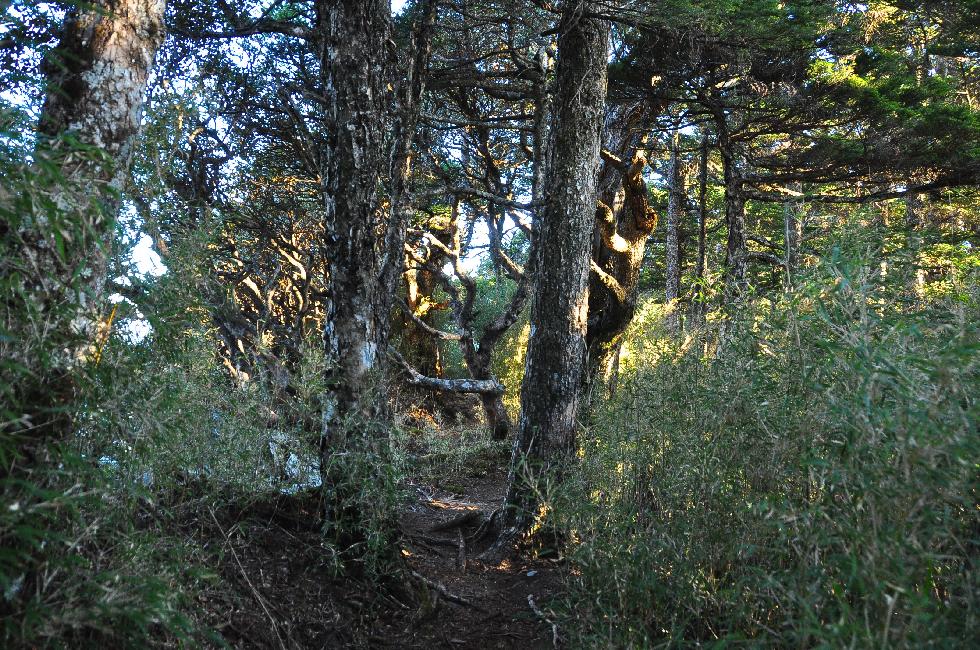 泡茶休息了近一小時,體力恢復了不少,再度背起重裝繼續朝合歡金礦營地前進。從吊橋至標高2350公尺的合歡金礦營地,距離約4.5K,爬升高度大約只有375公尺,可說是屏風山全程路況最優的路段。除了幾處稍陡的陡坡之外,大部份都走在寬闊的樹林中,尤其行走在五葉松木林間,踏著松針鋪地的柔軟步徑,真是輕鬆自在。松林營地就位於這片廣闊的松林間,從吊橋營地至此大約30分鐘,營地平坦又避風,算是頗為理想的紮營地點。只是資料上說這附近有穩定活水源,但我們在附近找了一下,只發現在過營地後續行約30公尺處有一鋁臉盆的不穩定水源(或許雨季水量會大一點吧)。