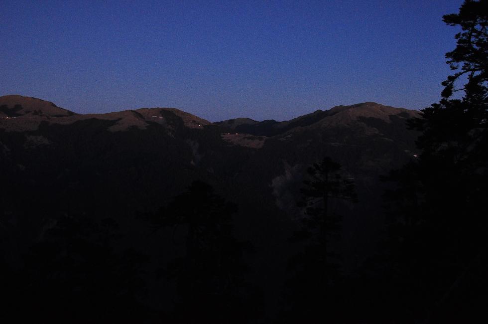 過最後水源後開始一路陡升至稜線,這也是今天最具挑戰的路段。一路拉繩不斷,陡坡連連,還有多處90度的岩壁,攀爬過程喘如柴犬,又累又爽!何先生腳程快,體力過人,利用我們停歇休息時獨自先行。隨著高度的爬升,慢慢的已 能看到對面合歡群峰間台14線的燈火。此刻天空已逐漸由黑轉為靛藍,合歡群峰清楚可辨,心中大喜!這麼好的天氣,今日大景可期。
