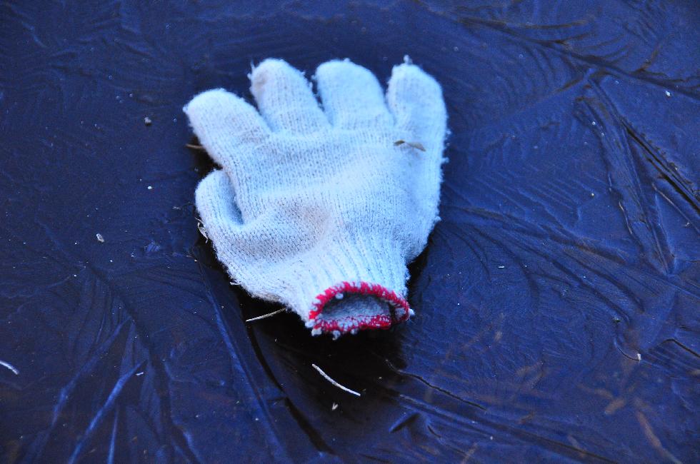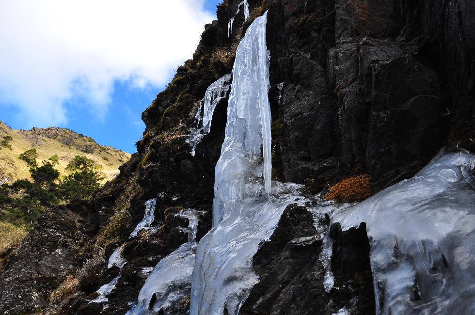 望著綿延的箭竹草坡,令人心曠神怡!沒想到難纏的屏風山也有如此柔美動人的一面,算是對通過無數險阻考驗,堅持到最後的岳人一點獎賞吧。隨著陽光普照,清晨的寒意一掃而空,踩著愉悅輕快的腳步,繼續朝三角點邁進。眼前屏風山的左後方就是無明山和中央尖山,雄偉山容令人神往。途經心形看天池時,忽然覺得池面紋路怪怪的?走近一看「哇!快來看,池面結冰了耶!」,我驚呼大家過來。阿煒還把手套丟向池中,整隻手套掉在冰上動都不動。後來拿起登山杖敲擊池面,只聽到清脆的喀喀聲響,池面結冰完全無碎裂,看來冰應該結的蠻厚的。