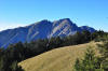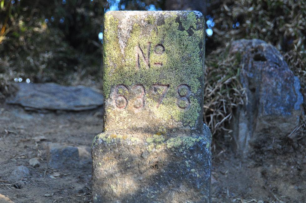 於07:08終於順利登上海拔3250公尺,百岳排行六十的屏風山,從合歡金礦至此,大約走了4.2K。三角點位於樹林當中,周圍並無展望,靠近三角點前的路徑有點混亂,穿行在 一人高的箭竹當中,好像都是路,不過並不會太難找。我們在三角點待了半個多小時方才下山,再度回到稜線的草坡時,太陽已高掛,藍天下的群峰更青翠了,讓我們有點捨不得下山去 ,畢竟也是千辛萬苦才爬上這邊的。來日有機會再訪屏風時,不知能否再遇上這麼好的天氣。