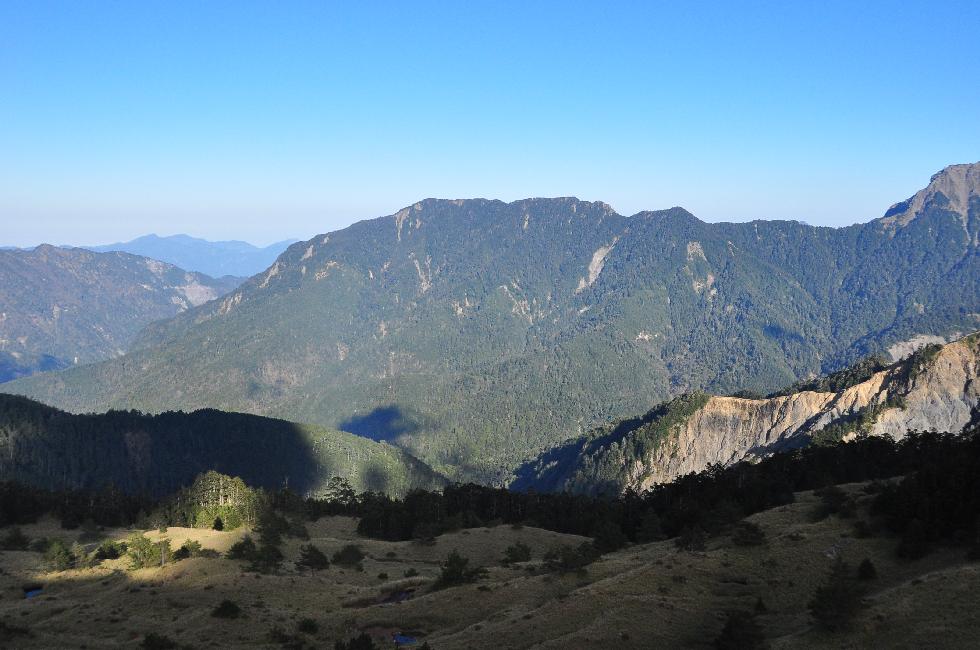 順著草坡往三角點續行,右前方可見屏風山頭,不過三角點還在那些山頭的最後面。途中展望奇佳,美景連連,北可見無明山和中央尖山雄偉的崩壁,南望奇萊北峰,峰頂如戟插天。向東連接,奇萊東稜由南向北依序為太魯閣大山、帕托魯山和立霧主山,以及座落在立霧溪流域的太魯閣七雄等名山皆羅列在前。而距離三角點前約50公尺處,有一眺望合歡群峰之絕佳展望點,除了合歡群峰之外,甚至連更遠的聖稜線及雪山西稜皆清楚可見。