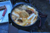 離開最後水源,路徑轉趨合緩,不然從稜線一路下來,煞車皮都快冒煙了~。在10:20終於回到合歡金礦營地,昨天攻頂的那一隊已下山了,現場只剩下我們及何先生的帳篷。大夥們趕緊將裝備收一收,阿煒也順便炊主午餐。我們將昨天沒吃完的火鍋再加熱,順便丟幾包泡麵下去煮,並請何先生不用煮了,跟我們一起吃就好。 我們四人將整鍋的雜菜麵吃到連廚餘都沒留下,算得還真巧。