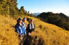 到後面越來越陡,05:40抵達碎石坡,過此碎石坡意味著稜線已不遠。繼續拉繩上攀,於06:05終於擺脫陡坡的考驗,登抵稜線的三叉路。此處海拔標高3250公尺,從合歡今礦至此,爬升約900公尺,其中過最後水源 就一路陡升770公尺更是磨人~。三叉路往右是奇萊北的路線,左才是往屏風山三角點。當登上稜線那一刻,正好趕上屏風山的日出秀。橙紅色朝陽在太魯閣大山方向升起,耀眼的陽光將屏風山東側草坡,染成一片金黃。大夥們看得驚呼連連,一切的辛勞早已被陽光給蒸發,剩下的只有苦盡甘來的喜悅與滿足。