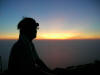 此時正是夕陽西下時,整個市區的建築物在陽光斜照下,呈現一片明亮耀眼的金黃色,見時間已近18:00,為能即時欣賞到最美麗的海上夕照,我們再起身前往面海的少女峰。於18:25行抵少女峰時,太陽正好在接近海平面之際,夕陽的倒影在海面上留下一條金色的緞帶,伴著翩翩船影在灑滿金光的海面上搖曳。西邊天際已被染成一片火紅,直到夕陽完全沒入遠方的海平線,天空卻依然如一塊不肯歇息的畫布般,紅、橙、黃、紫不斷的變化著。在此文仔拿出我們預買的大腸夾香腸,一人一份邊吃邊欣賞夕陽美景,滿足的不得了。一陣涼風從海上襲來,方才喚醒沉醉在餘暉幻境中的我。抬頭仰望天空,皎潔的明月已高掛天際,已呈橢圓的月亮大概再三天就月圓了。華燈初上,起身收起裝備,續往南壽山三角點移動,去欣賞美麗的都市夜景。