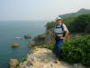 來到海岸的小山頭邊,發現下方浪濤聲轟隆作響,往下探去發現是一個海蝕洞。其洞口直徑約三公尺,洶湧的海水不斷的灌進來,拍打著岸邊的礁岩,蔚為奇觀!小山頭為珊瑚礁所構成,密生的海岸植被當中,有一條明顯步徑直通山頭頂端的三角椎形標誌,再往右鑽一小段路,眼前豁然開朗。好一處天然的觀景台啊!360度的展望,凝視台灣海峽,海天一色。陣陣海風迎面吹拂,伴隨著浪濤聲,令人心曠神怡。這裡亦是欣賞夕陽的絕佳場所,日落時分,金黃色的海面船隻搖曳。目隨波濤蕩漾,心在遠方,美麗更輝煌。