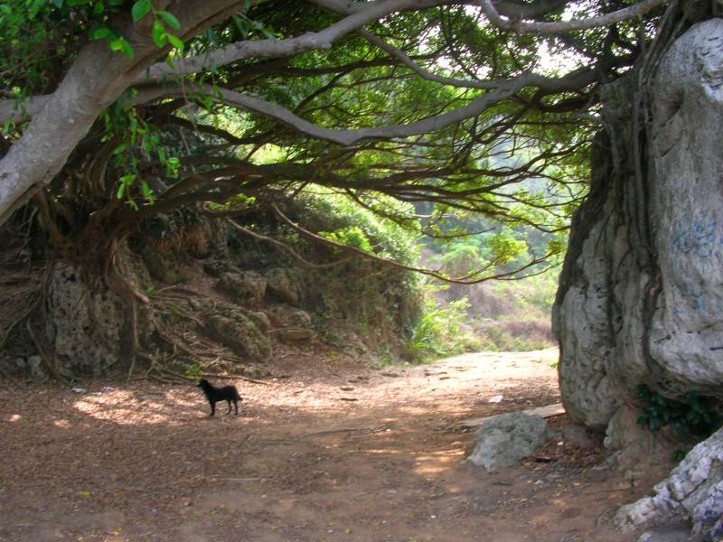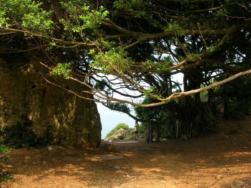 下了礁岩往北側海岸走去,後方樹林有一巨大榕樹盤踞於巨石當中,樹下寬闊平坦涼爽怡人,亦是怕日曬者,休憩觀海景的最佳處所。在休息區北側有一明顯步徑可通至海岸,步道盡頭立了一塊紅色警示牌寫著軍事要塞,左側邊坡則有一條陡直的步徑可下切至下方的礁岩區,步道上還綁有一條長長的繩索方便攀附。站在邊坡上遙望美麗岩岸,風光秀麗,海水清澈,岸邊幾棟軍事營房座落其間。由於長期處於軍事管制區,甚少受到人為污染,方能保有這麼一塊淨土。
