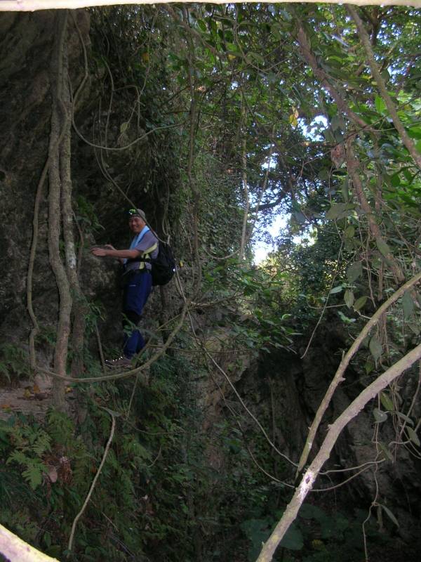 而在大峽谷另一側還有一處秘境,叫做「深谷洞」,顧名思義應是一處深幽的洞穴,地圖上並未標示。好奇順著岩壁上的箭頭指示來到入口,驀然發現下方的崖洞巨大深邃,根本看不到底!由於周圍完全沒有任何繩索可攀附,冒險往前下到崖壁邊已無法再往前,順手剪起一顆石頭往下丟,過約兩秒方聽見石頭掉落地面的迴音。如此萬丈深淵真不知是否只有此入口?如是,那真不知該如何才能下得去…。一切待來日再詳探了。