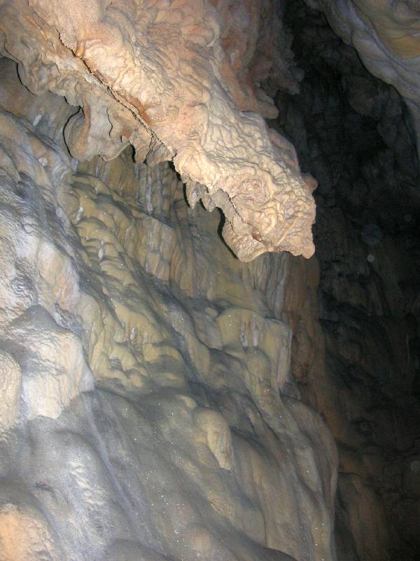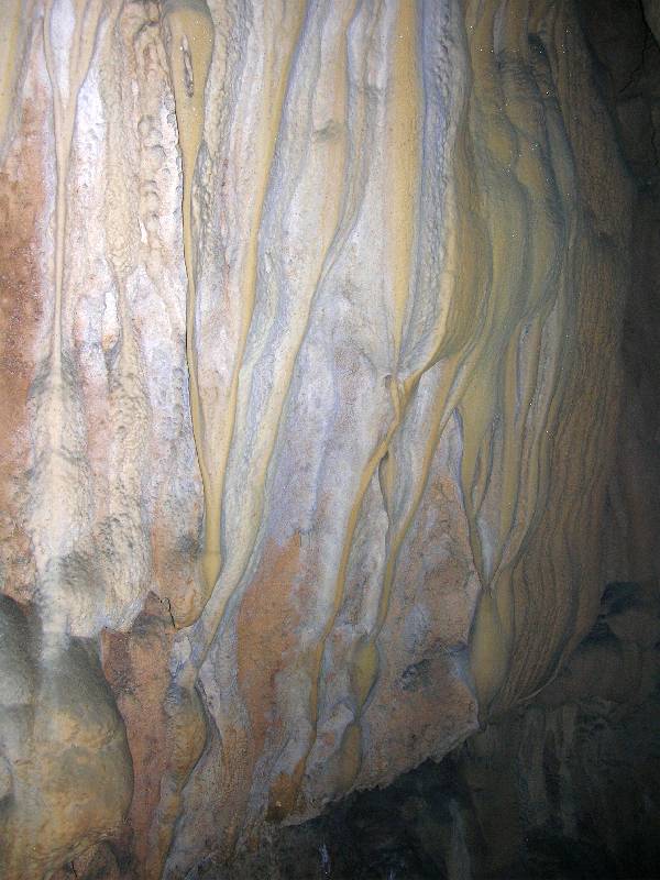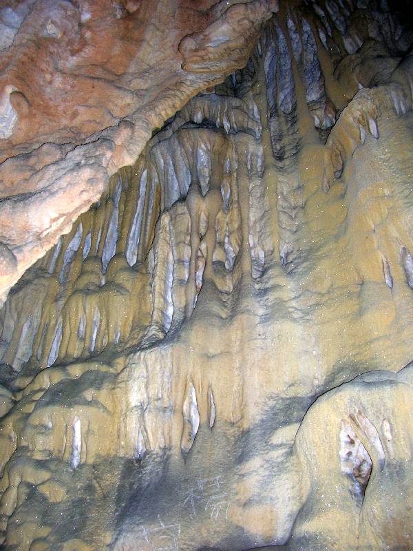 順繩梯下去後,又續往下延伸,旁邊有繩索垂掛,直入黑暗的洞裡。直下底部再順左側巨石下迂迴攀下一小段繩梯可至第二層。小心翼翼踩著濕滑的岩石終下至第三層底部,全程一路下來深達數二、三十公尺,穴中鐘乳垂掛,形狀多變生姿,令人目不暇給,除了佩服造物者之巧手外,更感受到大自然變化之奇妙。