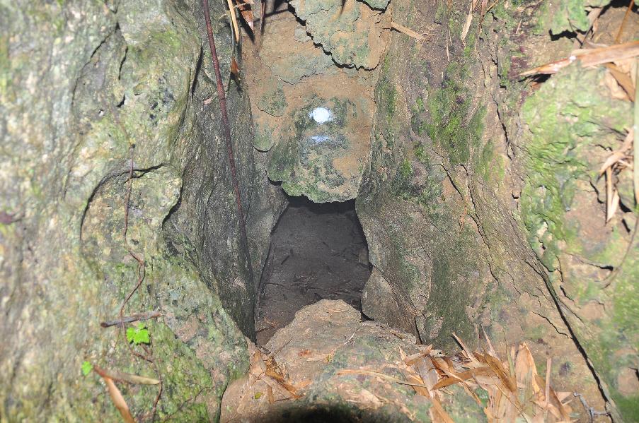 朝天的巨大開口,下雨可直下洞底,謂之「天雨天財」真名副其實。洞穴中除了進來的通道外,左側亦有一穴相通,各種形狀的鐘乳石的的狀似靈芝,有的有如雄鷹展翅,千奇百怪的造形引人入勝。