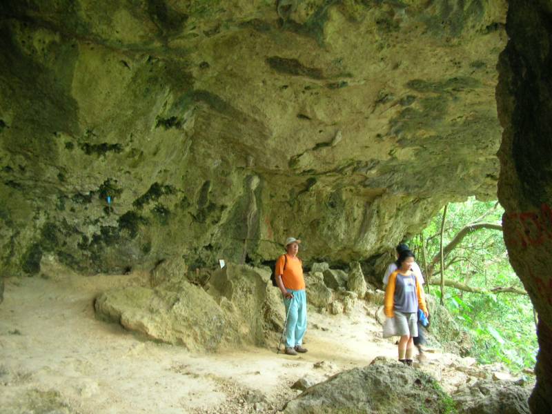 離開大深谷往泰國谷方向續行,途中還經過一處不知名的洞穴,穴中有一些瓷碗盤,頗令人好奇。離開洞穴我們先至泰國谷上方的休息平台歇息片刻,這處休息區有一鐵橋橫越於兩岩壁之間,立於鐵橋上方俯視泰國谷景觀,可感受那腳底數十公尺深峽谷的險峻之美。休息畢再帶賓仔前往「石厝」一遊,這是一處由岩石自然形成的一處半掩石窟,位於泰國谷旁木棧道的另一端。總面積達數十坪的天然岩窟,宛如一間石屋一般,約可容納百餘人。要是遇到刮風下雨,置身其間真是絕佳的蔽護場所。