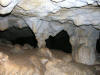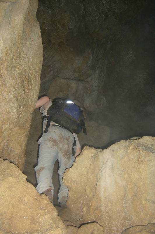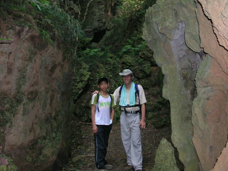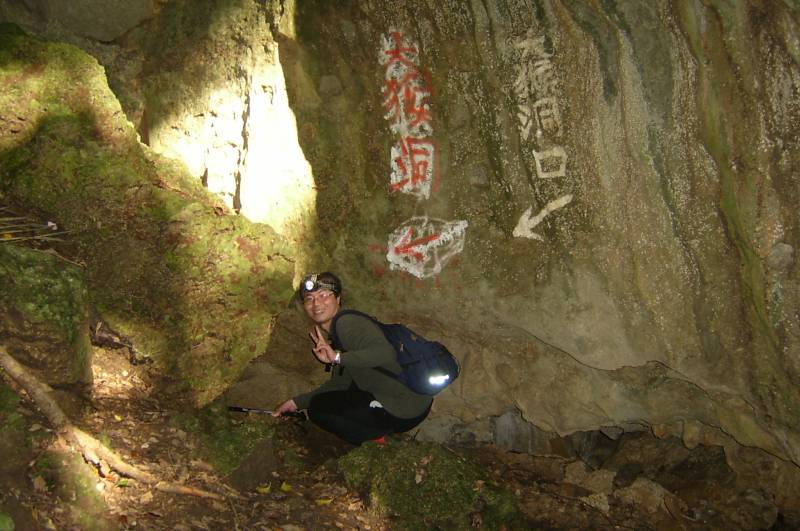 在洞穴中抬頭可見一洞口在上方,陽光從縫口射了進來,能見度不成問題,洞內有一天然的石桌板,周圍並有石倚,看似有人在此泡茶歇息的痕跡。四周岩壁濕漉,有些鐘乳石還在滴著水,看到如此幻境般的景致,我與文仔拿起相機開始猛拍,然而兒子、峰仔他們卻逕自一直往洞穴深處走去,我們拍完照也趕緊追上。越往深處越是漆黑,到最後幾乎完全伸手不見五指,由於我的頭燈電力不怎麼夠,一不小心還滑了一跤!昏暗的燈光照去,連呼吸都可見到蒸汽,可知洞穴內部溫度之低。大夥們在洞穴中喊叫,聲音都還會迴盪,不知在深邃暗無天日的洞穴爬了多久,忽聞峰仔傳來說:「前方好像沒路了~」,心想怎麼可能,明明這個洞穴是可通出去的才是,於是再叫他找找看,如果真出不去再考慮回頭,不久果然就讓峰仔找到上攀繩索處了。