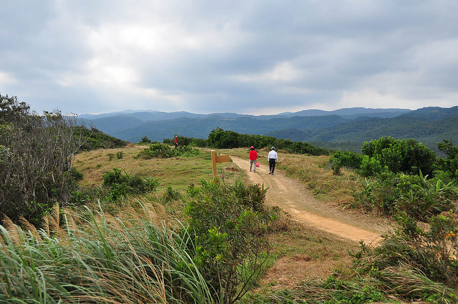 牡丹鼻山位於旭海大草原上,欲探訪此山頭有兩條路線(如路線圖),一是從西北端「旭海旅遊資訊站」大停車場進去的草原步道,另一條為旭海漁港旁的生態步道。我們上午因走完阿朗壹古道,於是便直接從東南端的生態步道上去。生態步道較長,從步道入口至牡丹鼻山三角點約需四十分鐘左右。而草原步道則比較短,只要十分鐘左右即可達。